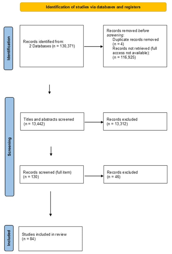 In the second phase of the literature review, we reviewed all the titles of the searched items and collected 130 possible relevant studies for our research area. We excluded 4 duplicates. After we read all selected articles, we excluded the irrelevant ones, and the final number of included studies in the systematical literature review was 84. The description of those articles is in the Results section. For a more visual picture of the search process for the literature review, please refer to the PRISMA diagram in Figure 1.