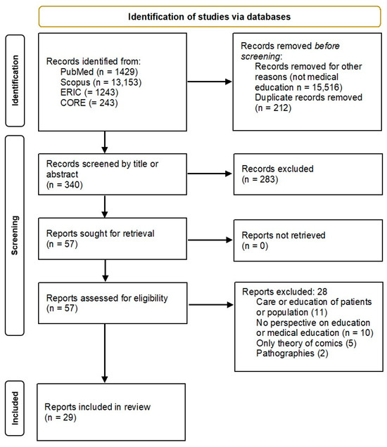 The following databases were accessed: PubMed, Scopus, ERIC, and CORE for grey literature. The reference list of the retrieved reviews and other kinds of articles was also scanned. In PubMed, different combinations of search terms were used, such as “graphic novels as topic” [MeSH Terms] or “graphic novel”, “comics”, and “comic book”, further refined by adding AND “Education, medical” [MeSH Terms]. In Scopus, ERIC, and CORE, combinations of the terms “graphic novel”, “comics”, and “comic book” were further refined adding AND (“medical student” OR “medical education”).