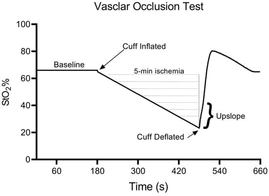 Once the rest period was over, the upper and lower BP cuffs were simultaneously and rapidly (<0.3 s) inflated to a suprasystolic value (~200 mmHg) and these cuffs were automated by two identical devices (E20 Rapid Cuff Inflator, D. E. Hokanson, Inc., 12840 NE 21st Place, Bellevue, WA 98005, USA). At the level of the upper arm and wrist, the total blood flow occlusion (i.e., transient ischemia) was maintained for 5 min while the NIRS device continuously recorded StO2. After 5 min of transient ischemia, only the upper cuff was deflated, which induced reactive hyperemia while preventing blood from pooling in the hand vasculature. During the VOTs, the continuous assessment of StO2 allowed for the determination of the upslope (i.e., rate of reperfusion). This upslope value was defined as the linear change in the StO2 value following the 5 min of ischemia and used as a marker of reactive hyperemia [38,49], and thus, peripheral vascular function (Figure 1).