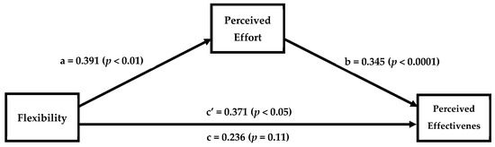 To check our manipulation of the commercial exercise program, a one-sample t-test with the scale midpoint (5) as the test value was used to assess whether the program’s structure was best defined as “rigid” or “flexible”. The mean rating (M = 3.65) of the items assessing the program’s flexibility was significantly different to the midpoint (t = −10.870; df = 253; p < 0.001; 95% CI [−1.593, −1.104]), suggesting that all participants perceived Beachbody as being a rigid (vs. flexible) program. Linear regression analyses supported that individuals’ flexibility influenced their perception of the effort needed in the program (B = 0.390; SE = 0.141, p < 0.01, 95% CI [0.112, 0.669]) and the effectiveness of the program (B = 0.371; SE = 0.154, p = 0.02, 95% CI [0.068, 0.675]); as flexibility increased, so did the perception of the effort needed and the perceived effectiveness of the program. Using bootstrapping procedures [50], we tested the mediating role of perceived effort by computing a 95% CI around the effect of flexibility on perceived efficacy through the proposed mediator (Model 4). The mediation pathway through perceived effort was significant (indirect effect: 0.0411; 95% CI [0.034, 0.253]; see Figure 2). Individuals with higher degrees of cognitive flexibility perceived the program to require more effort (due to a mismatch), whereas individuals with lower degrees of cognitive flexibility perceived the program to require less effort (due to a match). Participants also reported their sex and age (M/age = 20, SD/age = 1.9 yrs; 51% male). Including these variables as covariates in the mediation model did not significantly alter the results; the mediation pathway through perceived effort was significant (indirect effect: 0.1406; 95% CI: 0.030, 0.269).