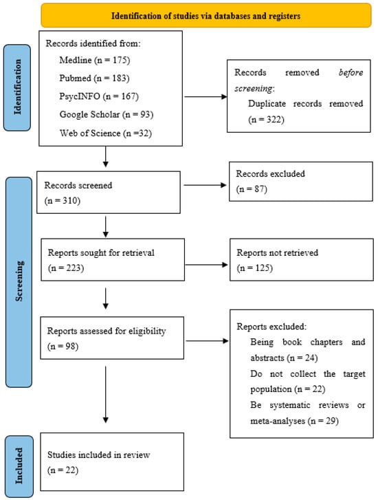 During the initial search for studies, a total of 632 potentially eligible articles were found, distributed as follows: 175 from Medline, 183 from PubMed, 167 from PsycINFO, 93 from Google Scholar (via manual bibliographic search), and 32 from Web of Science. Figure 1 presents a flowchart illustrating the study selection process, following the PRISMA statement [32]. Out of this total, 322 duplicate references were discarded. Finally, a total of 22 articles have been selected and included in this systematic review (Table 1).