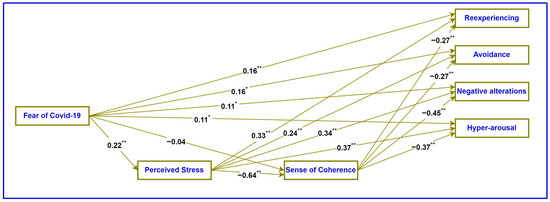 The indices of skewness (−0.18 to 0.35) and kurtosis (−1.18 to −0.16) were within an acceptable range and confirmed that the data were approximately normally distributed. All the scales demonstrated satisfactory reliability (α = 0.82 to 0.89). Fear of COVID-19 was significantly positively associated with re-experiencing (r = 0.28, p < 0.001, small effect), avoidance (r = 0.26, p < 0.001, small effect), negative alterations in mood and cognition (r = 0.26, p < 0.001, small effect), and hyper-arousal (r = 0.28, p < 0.001, small effect). Thus, higher levels of fear of COVID-19 were associated with higher levels of PTSD. Similarly, perceived stress was significantly positively associated with re-experiencing (r = 0.54, p < 0.001, large effect), avoidance (r = 0.45, p < 0.001, medium effect), negative alterations in mood and cognition (r = 0.65, p < 0.001, large effect), and hyper-arousal (r = 0.63, p < 0.001, large effect). Higher levels of perceived stress were thus associated with higher levels of PTSD. SOC was significantly negatively associated with re-experiencing (r = −0.51, p < 0.001, large effect), avoidance (r = −0.45, p < 0.001, medium effect), negative alterations in mood and cognition (r = −0.69, p < 0.001, large effect), and hyper-arousal (r = −0.63, p < 0.001, large effect). Higher levels of a SOC were therefore associated with lower levels of PTSD.