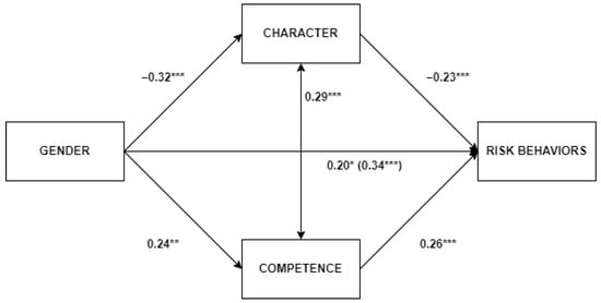 Table 7 shows the results of the partial mediation analysis of the relationship between gender and the overall score in risk behaviors through the effects on character and perceived competence. Figure 1 represents the standardized coefficients of the relationships included in the model. The results indicated that the effect of gender on risk behaviors was partly mediated by the indirect effects of character and perceived competence. The gender effect on risk behaviors remained significant after the inclusion of both mediators (i.e., character and perceived competence). The total effect of gender on risk behaviors (before including the mediators) was β = 0.34, p < 0.001, and it was reduced to β = 0.20, p = 0.006. Thus, gender differences in risk behaviors (with females presenting lower scores) were partly due to their greater scores in character and their lower scores in perceived competence. As well, a positive interrelation was observed between character and perceived competence.