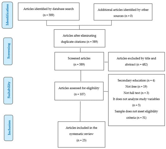 A total of 589 articles were found with the search equation and 107 were selected according to the title, which was considered relevant to the research topic. These were analyzed individually; 82 were discarded for not meeting the eligibility criteria to finally select 25 studies, which were analyzed in depth (Figure 1).