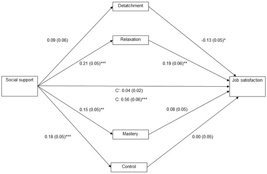 Parallel mediation model linking social support and job satisfaction (n = 496). Note: *** p < 0.001, ** p < 0.01; * p < 0.05. C = Direct effect of social support on job satisfaction; C′ = Indirect effect of social support on job satisfaction.