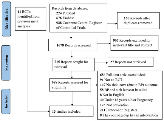 We conducted study selection following the PRISMA 2020 statement [12]. We extracted data on the number of people reporting BP and sickness absenteeism for BP in an intention-to-treat analysis [13] (Supplementary Materials S10). In the case of only a per-protocol analysis or an undefined analysis, we used the available data that were reported.