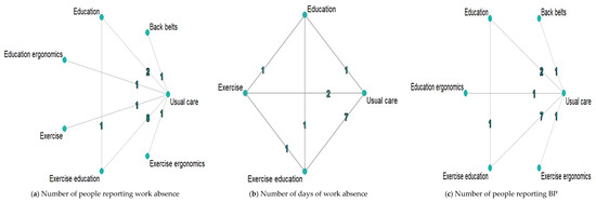 Exercise combined with education, exercise combined with ergonomics, education combined with ergonomics, education, and back belts were not likely to reduce the number of people reporting work absences. These results were consistent with those of previous meta-analyses [7,8]. Exercise was significantly effective compared to exercise combined with education, education combined with ergonomics, education, and back belts in reducing the number of people reporting work absences due to BP. These results are consistent with the previous network meta-analysis [8].