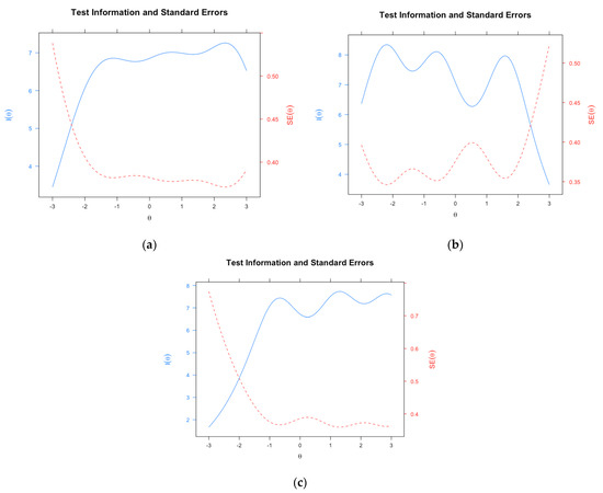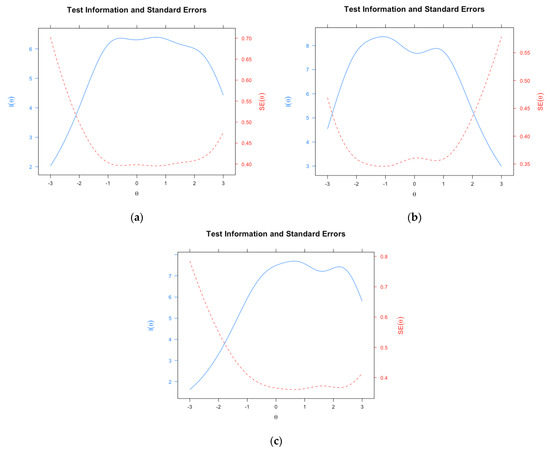 Phophikat-45 test information function for the Taiwanese Chinese Sample. Graphs from left to right depict (a) gelotophobia, (b) gelotophilia, and (c) katagelasticism, respectively, in the Taiwanese Sample. I represent information and θ represents latent trait. SE represents standard error.