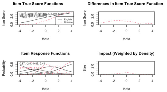DIF was used to determine whether biases across the Canadian English and Taiwanese Chinese versions existed. Crane et al. [54] recommended an ordinal regression approach to DIF that follows Samejima’s [47] graded response model (GRM) [55,56]. Based on the latent trait, each item incorporates three separate ordinal regression models. Model 1 (scores) includes the model at baseline with response probabilities regressed on the latent trait. Model 2 (scores and group) is a uniform DIF model with the main effect specified by group. Model 3 is a non-uniform DIF model that includes an interaction term between the participants’ latent trait and group-specific covariate [57]. Uniform DIF is identified with the comparisons of models 1 and 2 and non-uniform DIF is established with comparisons between models 2 and 3 [57]. Total DIF effects are established with comparisons between models 1 and 3 [54,58,59].