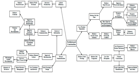 Prefabrication enhances workers’ productivity [75,76]. Increased productivity reduces workload and work pressure. Furthermore, the reduction in the dependence on weather [14] ensures a reduction in both on-site and overall project duration. In addition to the better project time management benefit of prefabrication, the prospect of reducing time pressure and improving work–life balance and, consequently, reducing workers’ health stressors, is enhanced. Less work-related stress could be the much-needed catalyst for workers to undertake further learning for their personal and career development. This can enhance their skills and could ensure job security. With career development comes promotion, task autonomy, and decision-making roles. These can enhance workers’ socio-economic status.