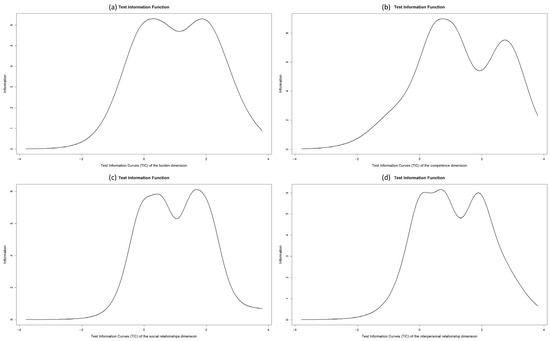 Figure 1 shows the test information curves for each dimension. The reliability (accuracy) of the overload dimension is between −1.8 and 3, the competence dimension between −1 and 3, the social relationship dimension between −1 and 3, and, finally, the interpersonal relationship dimension is between −1 and 3.5.