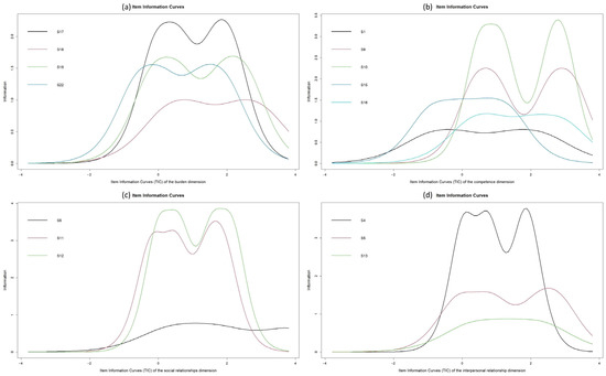 Figure 2 shows the information curves per item for each dimension. In the overload dimension, item 17 is the most accurate item for the evaluation of the latent trait. In the competence dimension, item 10 is the item that shows the greatest discriminatory capacity for the measurement of the variable. In the social relationship dimension, items 11 and 12 show the highest accuracy. Finally, in the interpersonal relationship dimension, item 4 shows the highest discrimination.