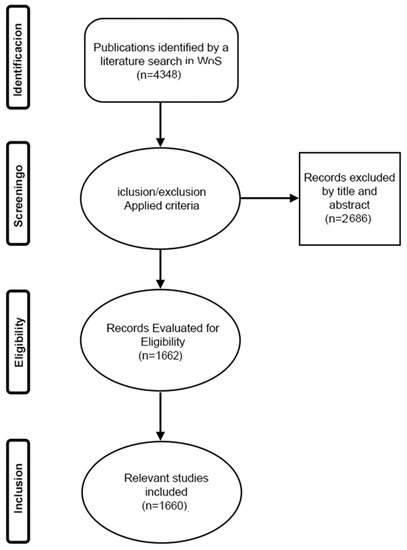 The 4348 articles initially collected underwent a double-blind evaluation to eliminate bias in the application of criteria. In this sense, the relevance and eligibility of each record was evaluated, and 2686 irrelevant documents were excluded. This process was performed by two authors in parallel to eliminate selection bias. Double review resulted in 98.3% agreement (% of items matched with a probability of 1.0). Authors met via the Zoom platform and discussed articles where ratings differed. Once the details of each of the articles had been analyzed as a group, a consensus was reached on their inclusion or exclusion. Once the process was completed, 1660 records were selected for bibliometric analysis (see selection route in Figure 1). Finally, the records were exported to MS Excel. This entire preliminary evaluation process was completed on 31 June 2022.