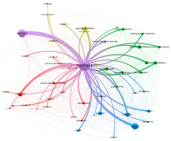 This study also investigated the keyword co-occurrence network (KCN) to gain a global view of trends in childbearing and the autism spectrum. The KCN analysis presents the close relationship that occurs between the keywords in the literature, which provides an idea of the knowledge structure of the field [46]. This analysis provides an overview of the topic that goes far beyond the simple representation of the keywords, as it shows their connections (see Figure 3). It is possible to observe that the word with the highest representation, mothers, is connected to four thematic axes; for example, the green cluster is related to mental health and social support, the blue group is associated with the impact of autism on the family, the red cluster with a predominance of clinical semiology, and the yellow cluster with early childhood.