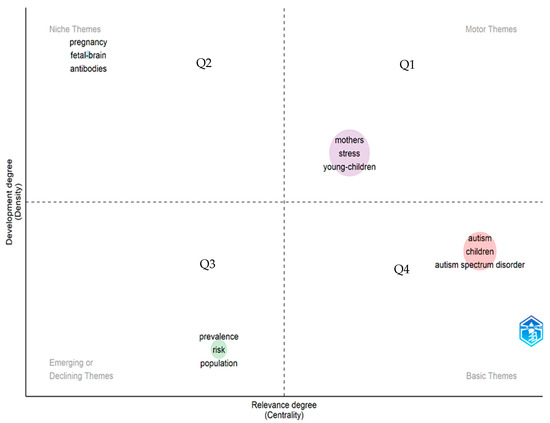 We also analyzed the thematic map of maternity studies related to ASD to obtain a holistic view of the current state of the field and its sustainability over time. These themes are characterized by two properties (density and centrality). Density is plotted on the vertical axis and centrality on the horizontal axis. Centrality is the degree of correlation between different themes, and density measures the cohesion between nodes [46]. The visualization of the themes helps us to understand if they are well developed and what their degree of importance is. In this sense, the greater the number of relationships that a node has with others in the thematic network, the greater its centrality and importance. In our case, we provide the thematic map of the field of maternity linked to ASD, divided into four quadrants (Q1 to Q4). For example, the upper right quadrant (Q1) represents driving issues, the lower right quadrant (Q4) represents underlying issues, the upper left quadrant (Q2) represents highly specialized issues, and the lower left quadrant (Q3) represents emerging issues or issues that disappear (see Figure 4).