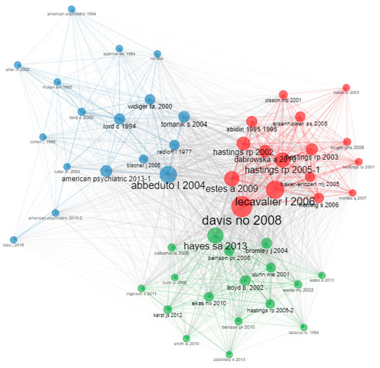 Regarding co-citation authors, according to Aria and Cuccurullo [47], closeness measures how many steps are required to access all other vertices from a given vertex. On the other hand, page rank approximates the probability of any message reaching a particular vertex. In the first group, there are 17 authors (blue cluster). Davis is the most prominent author (with a betweenness centrality value of 58.6, page rank of 0.04, and closeness of 0.01). The second group is made up of 16 authors (red cluster). Abbeduto stands out in it (with a centrality value of 32.1, page rank of 0.02, and closeness of 0.01). The third group is made up of 17 authors (green cluster). The main author on this group is Hayes (with a betweenness centrality value of 27.1, a page rank of 0.03, and a closeness value of 0.01) (see Figure 5).
