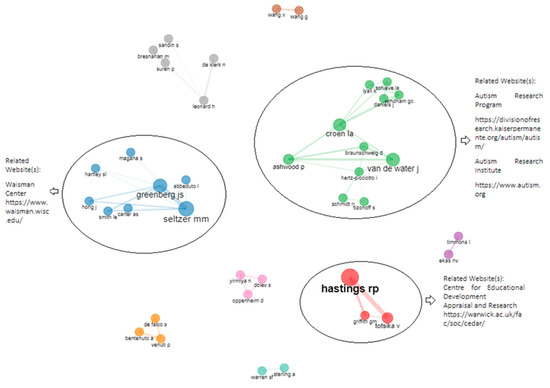 Collaboration network of the most representative authors in the field of maternity and ASD. Related websites: https://www.waisman.wisc.edu/ (Accessed on 4 April 2022), https://divisionofresearch.kaiserpermanente.org/autism/autism (Accessed on 4 April 2022), https://www.autism.org/ (Accessed on 4 April 2022) and https://warwick.ac.uk/fac/soc/cedar/ (Accessed on 4 April 2022).