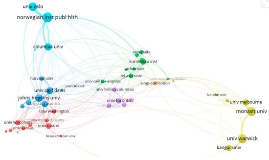 A total of 1831 publications registered in WoS institutions are involved in the scientific production of maternity and ASD. In Figure 7, it can be seen that the main institutional collaboration networks are mainly grouped into six clusters. The most representative institutions from each cluster are the University of California (Davis) (n = 233 docs, dark blue cluster), the University of Wisconsin (n = 119 docs, red cluster), the University of Toronto (n = 36 docs, purple cluster), the Norwegian Institute of Public Health (n = 36 docs, light blue cluster), Monash University (n = 35 docs, yellow cluster) and the Karolinska Institutet (n = 30 docs, green cluster).