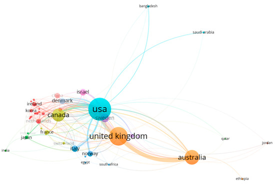 A total of 57 countries are involved in producing documents related to maternity and ASD. The USA (TC = 23,091; average article citations = 35.52) has the most significant weight in collaborations. Close collaboration can also be observed between the UK (TC = 4217; average article citations = 32.44) and Australia (TC = 2916; average article citations = 25.14), representing the second and third countries, respectively, with the most significant weight in collaborations (see Figure 8).