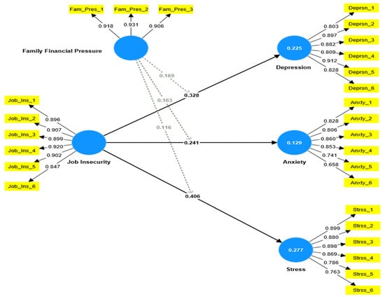 Figure 3 demonstrates the outcomes of the moderation assessment, which confirm that family financial pressures moderate the relationship under examination. The analysis performed using Smart-PLS demonstrated that family financial pressures significantly amplify the effect of job insecurity on employee experiences of depression (β = 0.169, t = 3.212, p < 0.001). This suggests that as family financial pressure increases, the effect of job insecurity on employee depression also increases, thereby supporting H4. Likewise, the results indicate that increased family financial pressure intensifies the influence of job insecurity on employee perceptions of anxiety (β = 0.163, t = 3.518, p < 0.001) and stress (β = 0.116, t = 2.238, p < 0.05). This enables us to affirm H5 and H6.