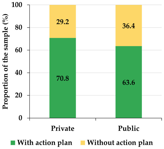Two samples of early childhood education professionals participated in the study: one formed by early childhood education teachers and the other formed by child psychologists. On the one hand, the first sample is made up of 70 early childhood education teachers, all of them female, with a mean age of 39.14 years (sd = 8.87) and a median age of 40 years, chosen by a non-probabilistic sampling process by convenience among the authors’ contacts. All early childhood education teachers are university graduates in Spanish early childhood education. A total of 68.57% belonged to private schools, while 31.43% came from public schools, which implies that there is a certain bias in favor of private schools (chi-square = 4.8286, df = 1, p-value = 0.0280). Likewise, 68.57% of the participating teachers have an action plan against bullying in their respective centers, while the remaining 31.43% do not. In this sense, there is also a certain bias in favor of teachers whose schools have an anti-bullying plan (chi-square = 4.8286, df = 1, p-value = 0.0280). The distribution of participants in schools with or without an anti-bullying plan is statistically independent of the way they are distributed in private or public schools (chi-square = 0.1813, df = 1, p-value = 0.6703) (Figure 1). Private early childhood education schools usually develop a specific educational project, which is that of its own entity. This owning entity is often, but not necessarily, a religious entity. Likewise, the families who take their children to these private schools do not necessarily belong to the economically privileged strata of society, because, for the most part, these schools are partially supported by Spanish public funds. In addition, it is worth noting that the number of pupils in Spanish pre-school education tends to range between 15 and 25 in each class. Moreover, the difference between average class sizes in public and private pre-primary schools is not significant in Spain.