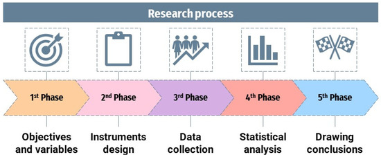 In this paper, we conducted descriptive quantitative research on the perception of early childhood education teachers and child psychologists about the situation of bullying in the early childhood education stage (3 to 6 years of age). For this purpose, the following research phases were followed (Figure 3): (i) definition of research objectives and variables; (ii) design of questionnaires; (iii) data collection; (iv) statistical analysis; and (v) drawing of conclusions.
