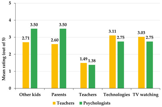 Teachers and psychologists agree that the influence of teachers is the least determinant factor in the development of bullying behavior. However, teachers believe that the most influential factors are the use of new technologies and television, while psychologists favor the influence exerted by parents and other children in the environment (Figure 5). In this sense, the greatest distances between psychologists and teachers are precisely in the evaluations of the influence of parents and other children, which are valued, respectively, 34.62% and 29.15% more by psychologists than by teachers.