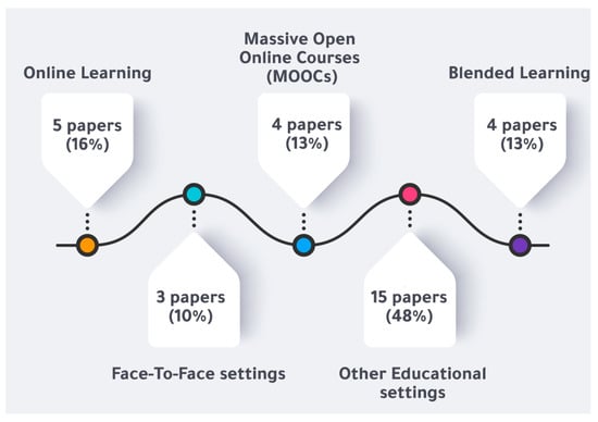 From our analysis of the chosen articles, we can see that the ID models and categories discussed have been integrated into a wide range of educational settings. They could serve as a reference for future ID researchers and instructors in recognizing and expressing the knowledge gap in the ID setting. The vast majority of the research we looked at used online learning as its instructional setting, which was the case for five publications (16%) [24,31,34,35,36,37,38,39,40,41,42,43,44,45,46]. MOOCs were used as an instructional setting in the following educational contexts, accounting for four publications (13%) [19,37,38,40]. Furthermore, four publications (13%) [17,29,39,43] in competition with MOOCs used blended learning for teaching and learning purposes. Three studies (10%) conducted their instruction in a face-to-face setting [22,36,41]. Furthermore, the remaining research employed a wide range of pedagogical settings, with 15 publications (48%) utilizing the following: Ref. [18] online education platforms for e-learning, ref. [21] virtual learning environments, ref. [23] courses integrated with the web, ref. [25] LMS through an online lab course, ref. [26] simulation-based training, and [27] Moodle and flipped instructional design (FID). The authors of [28] used LMS platform and flipped instructional design, while the authors of [30] used learning management systems (LMS). The authors of [32] used an internet-based interactive learning system. In [33], interactive instructional technology was used. The authors of [42] used interactive e-books; the authors of [44] used face-to-face and blended courses, and in [45], flipped learning environments were used. Finally, the authors of [47] used virtual teams. Figure 2 shows the ID models and educational settings.