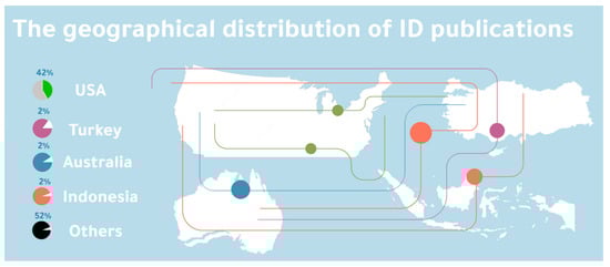 The study of ID in an educational context is geographically diverse, so there is no particular emphasis on places. There are, nonetheless, clear indications of high scientific activity in the USA, with 13 articles representing 42% of the total publications. Studies [19,21,24,25,33,34,35,37,39,40,43,45,47] were all carried out and published in the US. There have been just two investigations undertaken in Turkey [18,19,20,21,22,23,24,25,26,27], two more in Australia [22,23,24,25,26,27,28,29,30,31], and two in Indonesia [23,24,25,26,27,28,29,30,31,32]. In the interim, 12 papers were published globally, accounting for 39% of the articles examined: Ref. [17] Bangladesh (n = 1), ref. [20] India (n = 1), ref. [26] Uganda (n = 1), ref. [28] South Africa (n = 1), ref. [29] France (n = 1), ref. [30] Lebanon (n = 1), ref. [36] Malaysia (n = 1), ref. [38] Colombia (n = 1), ref. [41] China (n = 1), ref. [42] Mexico (n = 1), ref. [44] Costa Rica (n = 1), and [46] Canada and Spain (n = 1). Figure 4 depicts the geographical distribution of TDT and distance learning publications.