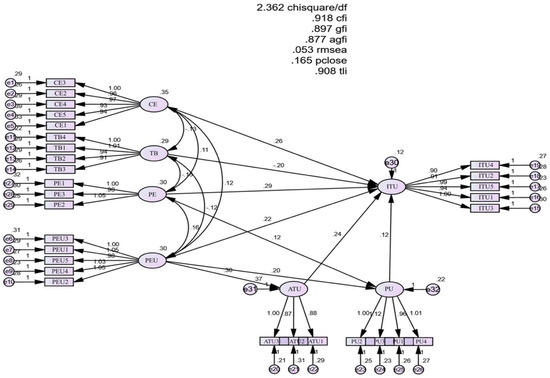 Table 6 shows the results of the hypothesis testing for the relationships between the factors in the proposed model. The p-values for the relationships are all below the 5% significance level. The relationship between PE and PU has a reliability of 90% at the 5% significance level, indicating that PE does not have a significant impact on PU in the same direction. However, at the 10% significance level, PE has a significant positive impact on PU. The study can also observe that at p < 0.05, PE, PEU, CE, ATU, and PU have a positive impact on ITU, while TB has a negative impact on ITU.