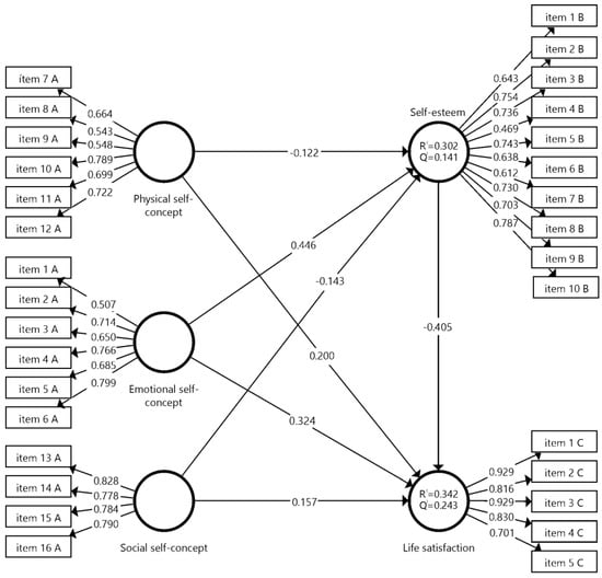 Table 4 shows the results of the hypothesis contrast, following the criteria of Hair et al. [53], to test the mediator effect in PLS-SEM. A t-test was obtained (values greater than 1.96 indicate the adequacy of the reflective model). The results showed the following: emotional self-concept -> life satisfaction (β = 0.324, t = 22.229, p < 0.001); emotional self-concept -> self-esteem (β = 0.446, t = 34.582, p < 0.001); physical self-concept -> life satisfaction (β = 0.200, t = 12.476, p < 0.001); social self-concept -> life satisfaction (β = 0.157, t = 10.136, p < 0.001) and, negatively, physical self-concept -> self-esteem (β = −0.122, t = 8.075, p < 0.001); self-esteem -> life satisfaction (β = −0.405, t = 27.811, p < 0.001); social self-concept -> self-esteem (β = −0.143, t = 9.386, p < 0.001), respectively, thus confirming the existence of mediation through the mediating variable self-esteem between emotional self-concept, physical self-concept, social self-concept and life satisfaction.