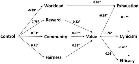 Structural modeling results of the partial mediational model of burnout (AWS and burnout relationships). * p < 0.05.