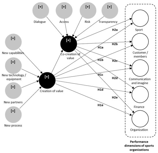 H1. Value creation directly and positively influences value cocreation between sports organizations and their customers. H1a: Higher levels of value creation lead to higher levels of sports performance in sports organizations. H1b: Higher levels of value creation lead to higher levels of customer/member performance in sports organizations. H1c: Higher levels of value creation lead to higher levels of communication and image performance in sports organizations. H1d: Higher levels of value creation lead to higher levels of financial performance in sports organizations. H1e: Higher levels of value creation lead to higher levels of organizational performance in sports organizations. H2a: Value cocreation positively mediates the relationship between value creation and sports performance in sports organizations. H2b: Value cocreation positively mediates the relationship between value creation and customer/member performance in sports organizations. H2c: Value cocreation positively mediates the relationship between value creation and image and communication performance in sports organizations. H2d: Value cocreation positively mediates the relationship between value creation and financial performance in sports organizations. H2e: Value cocreation positively mediates the relationship between value creation and organizational performance in sports organizations.