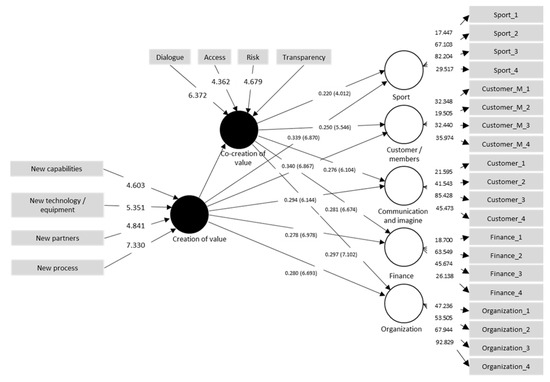 In this study, the structural model was evaluated in three steps [61]: the coefficient of determination (R2), predictive relevance (Q2), and path coefficients of the structural model. To this end, we employed SmartPLS software. The R2 values for the endogenous dimensions (i.e., sport, customers/members, communication and image, finance, and organization) were above the level of 10% recommended in [64]. Following the general rules, the R2 values of customers/members (0.27), organization (0.26), communication and image (0.25), sport (0.25), and finance (0.24) were weak. Based on the Blindfolding function, all the Q2 values were above zero: organization (0.193), communication and image (0.177), customers/members (0.170), sport (0.170), and finance (0.158). These values suggest the predictive relevance of the model regarding the endogenous reflective dimensions.
