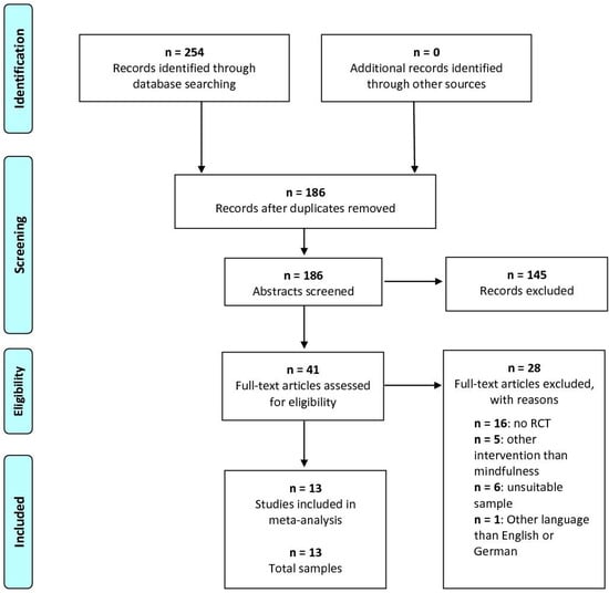 The literature search is summarized in the PRISMA flow chart (Figure 1). The initial search yielded a total of 254 articles. After removing duplicates and articles not matching the inclusion criteria, we identified 13 eligible randomized–controlled trials [,,,,,,,,,,,,] comprising 13 independent samples. Both depression and anxiety symptoms were assessed in 11 of the included studies. Stress was only addressed in seven of the eligible papers. The characteristics of all included studies are detailed in Table 1.
