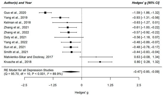 Analyses of small study effects did not detect any evidence of publication bias for the three symptom types. The funnel plots are shown in Supplementary Figures S2–S4. Sensitivity analyses revealed one influential outlier in the meta-analysis for depression [] as well as for stress []. However, the inclusion of these two studies did not bias the results substantially (the result of the depression meta-analysis analysis before exclusion: g = −0.47, 95% CI [−0.85; −0.09]; after exclusion: g = 0.45, 95% CI [−0.87; −0.03]; the result of the stress meta-analysis before exclusion: g = −0.42, 95% CI [−0.96; 0.11]; after exclusion: g = 0.44, 95% CI [−1.06; −0.19]).