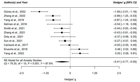 Forest plot of the meta-analysis comparing anxiety symptoms in the intervention group versus control group [,,,,,,,,,,]. This plot shows the results of the individual studies examining anxiety symptoms with their 95% confidence interval (CI). The weight of each study contributing to the overall effect is illustrated by the size of the square. The summary polygon at the bottom of the plot shows the results from the meta-analytic model for all included studies examining anxiety symptoms as well as its level of heterogeneity.