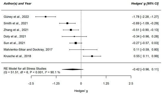 Forest plot of the meta-analysis comparing stress symptoms in the intervention group versus control group [,,,,,,]. This plot shows the results of the individual studies examining stress symptoms with their 95% confidence interval (CI). The weight of each study contributing to the overall effect is illustrated by the size of the square. The summary polygon at the bottom of the plot shows the results from the meta-analytic model for all included studies examining stress symptoms as well as its level of heterogeneity.