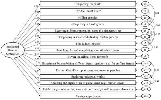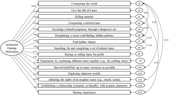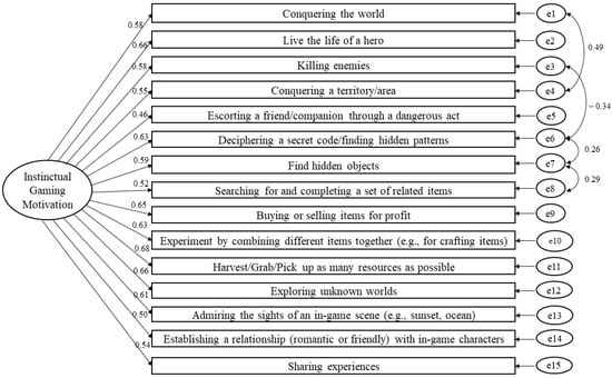 The one-dimensional model of the Gaming Instinctual Motivation Scale using confirmatory factor analysis based on the general gaming experience (standardized estimates).