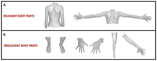 A visual match-to-sample task (VMT) was developed by a re-adaptation of the paradigm used by Frassinetti [32]. The presentation and randomization of the stimulus were controlled using PsychoPy V3.0 software [33,34]. A total of 96 trials divided into three blocks were randomly presented to each participant. At the beginning of each trial, 3 pictures appeared vertically aligned and centered on a screen. Stimuli were pictures of body parts taken with a digital camera and modified by means of Adobe Photoshop software (Photoshop CC 2019 version 20.0.8) to appear as gray-scale images on a white background. Pictures displayed either disease-relevant (i.e., shoulders and backs) or -irrelevant (i.e., hands, feet, legs, arms) body parts (Figure 1).