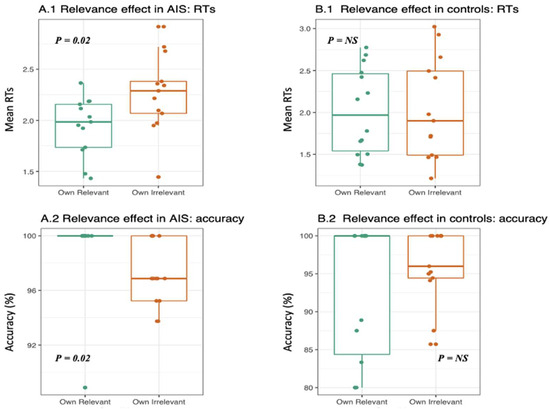 Body part relevance in AIS and controls. The boxplots represent average RTs and accuracy of AIS and controls in answering to their own relevant body parts (i.e., shoulders and backs—green dots) vs. their own irrelevant ones (i.e., arms, feat, legs, hands—orange dots). AIS group answered significantly (A.1) faster and (A.2) more accurately to their own relevant body parts compared to irrelevant ones. (B.1,B.2). No significant differences were observed in the control group.