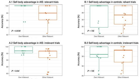 Self-body advantage effect in AIS and controls. Upper panels: The boxplots represent the accuracy of AIS (A.1) and controls (B.1) in answering to their own relevant body parts (i.e., shoulders and backs—green dots) vs. others’ relevant body parts (orange dots). (A.1) AIS group answered more accurately to their own relevant body parts compared to others’ ones. (B.1) No significant differences were observed in the control group. Lower panels: The boxplots represent (A.2) the accuracy of AIS and (B.2) controls in answering to their own irrelevant body parts (i.e., arms, feat, legs, hands—green dots) vs. others’ irrelevant body parts (orange dots). (A.2) AIS group answered more accurately to their own irrelevant body parts (green dots) compared to (B.2) controls.