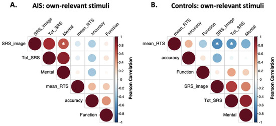 Correlation matrices. Correlation matrices between questionnaire scores (i.e., SRS_image: SRS-22r self-image domain; Tot_SRS: total score on SRS-22r; Mental: SRS-22r mental domain; Function: SRS-22r function domain), accuracy, and average RTs (i.e., mean_RTS). Subfigure A reports correlations for the AIS group, while subfigure B for the control group. Circles’ dimensions and colors identify the value of the Pearson correlation coefficient, i.e., largest dark red circle indicates maximum positive correlation (1), and largest dark blue circle represents maximum negative correlation (−1) between variables in the two axes. Asterisks indicate significant meaningful correlations.