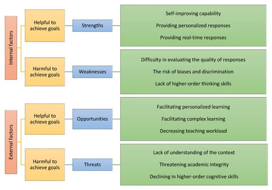 - Farrokhnia, M.; Banihashem, S.K.; Noroozi, O.; Wals, A. A SWOT analysis of ChatGPT: Implications for educational practice and research. Innov. Educ. Teach. Int. 2023, 1–5. [Google Scholar] [CrossRef]