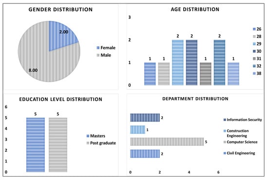 In Figure 3, the sample population consisted of 80% male participants and 20% female participants. The age distribution for the participants is ranging from 26 to 38 years, with a mean age value of 30 years. Most of the participants lie within the 26–30 age group (60%), followed by the 31–34 age group (30%) and the 35–38 age group (10%). In the current education level distribution, the number of participants remained equal between masters (50%) and postgraduate (50%) education levels. The participants also represented a wide range of distribution among different departments to which they belong. Most of the participants/students belong to the Computer Science department (50%), followed by the Civil Engineering, Information Security departments (20% each), and the Construction Engineering department (10%). The study involved participants from various nationalities of the world. Out of total 10, 25% of the participants were Norwegians, followed by participants from Italy, Georgia, Nepal, and Pakistan.