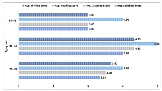 Figure 5 depicts the English language skills level distribution based on three age groups. We originally had only the age of each participant, and based on the age values we created three age groups (i.e., 26–30, 31–34, and 35–38). The age group 31–34 has the highest average scores of all the English language skill levels followed by the 26–30, 35–38 age groups, respectively. For the age group 31–34, the highest score for participants is in reading (5) followed by writing (4.33), listening (4.33), and speaking (4). The age-group 26–30, which consists of the 60% of the participants, also has the maximum average score for reading (4) followed by the writing (3.67), listening (3.50), and speaking (3.33). The age group that has the lowest average scores is the 35–38 group where the reading level has the highest average score (4) and rest of the English language skills levels have equal scores (3). The average score distribution for all four tasks for this group is also slightly different in comparison to the other two age groups.