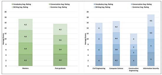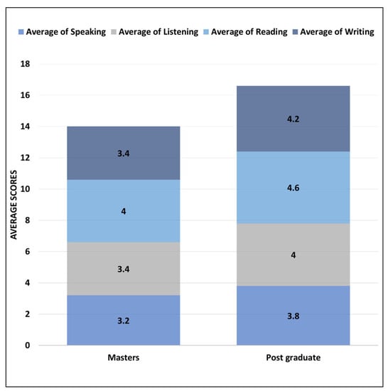 Figure 6 shows the distribution of average scores for different English language skill levels divided into the participants’ current education level. Overall, the postgraduate group has the highest scores in all the language skills as compared to the masters group. The reading skills of the participant is again leading here for both groups (i.e., masters and postgraduate) as compared to the remaining three English language skill levels. The lowest average scores in all the language skills seems to be for the speaking skill for both groups.