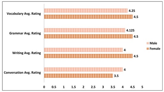 Figure 7 shows the distribution of participants’ average ratings related to the performance of ChatGPT for each of the task categories based on the gender attribute. The female group is higher in terms of average performance rating from ChatGPT for three task categories—vocabulary, grammar, and writing—with average scores of 4.5 for all the task categories. For the conversation task, the male group has more average performance rating as compared to the female group.