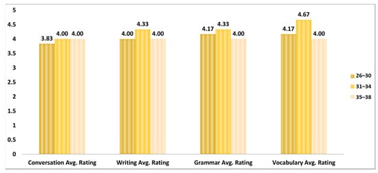 Figure 8 depicts the average rating of ChatGPT’s performance for all the task categories based on three age groups. The age group 31–34 has the highest average scores of performance rating for all the task categories followed by the 26–30, 35–38 age groups, respectively. For the age group 31–34, the highest score for participants is in the vocabulary task (5) followed by the grammar (4.33), writing (4.33), and conversation (4) tasks. The age group 26–30, which contains 60% of the participants, also has the maximum average score for the vocabulary (4.17) task followed by the grammar (4.17), writing (4), and conversation (3.83) tasks. The lowest average scores’ age group is the 35–38, which shows slightly different patterns in the average scores. All the task categories have the same average performance rating of 4.