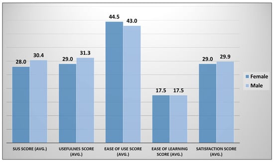 Figure 10 shows the distribution of participants’ feedback for all the five aspects of usability based on gender attributes. The male group is higher in terms of average score for three aspects e.g., SUS, usefulness, and satisfaction with overall scores of 30.4 out of 50, 31.3 out of 40, and 29.9 out of 35, respectively as compared to the female group. For the ease of use aspect, the female group has a higher average score of 44.5 out of 55 as compared to the male group. For the ease of learning aspect, both gender groups have the same average score of 17.5 out of 20.